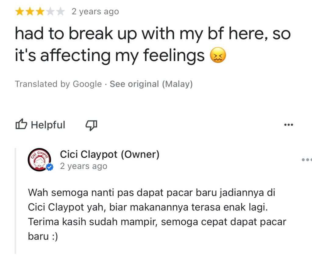 Waktu itu sih sempat drop rasanya, karena kalau kamu jualan makanan juga, kamu pasti merasakan betapa google review ini membantu kita berjualan. Sekarang kan orang apa-apa liat dulu reviewnya. Dikasi bintang satu itu ngaruh banget dari bintang 4.8 bisa-bisa turun sampai 4.6.
