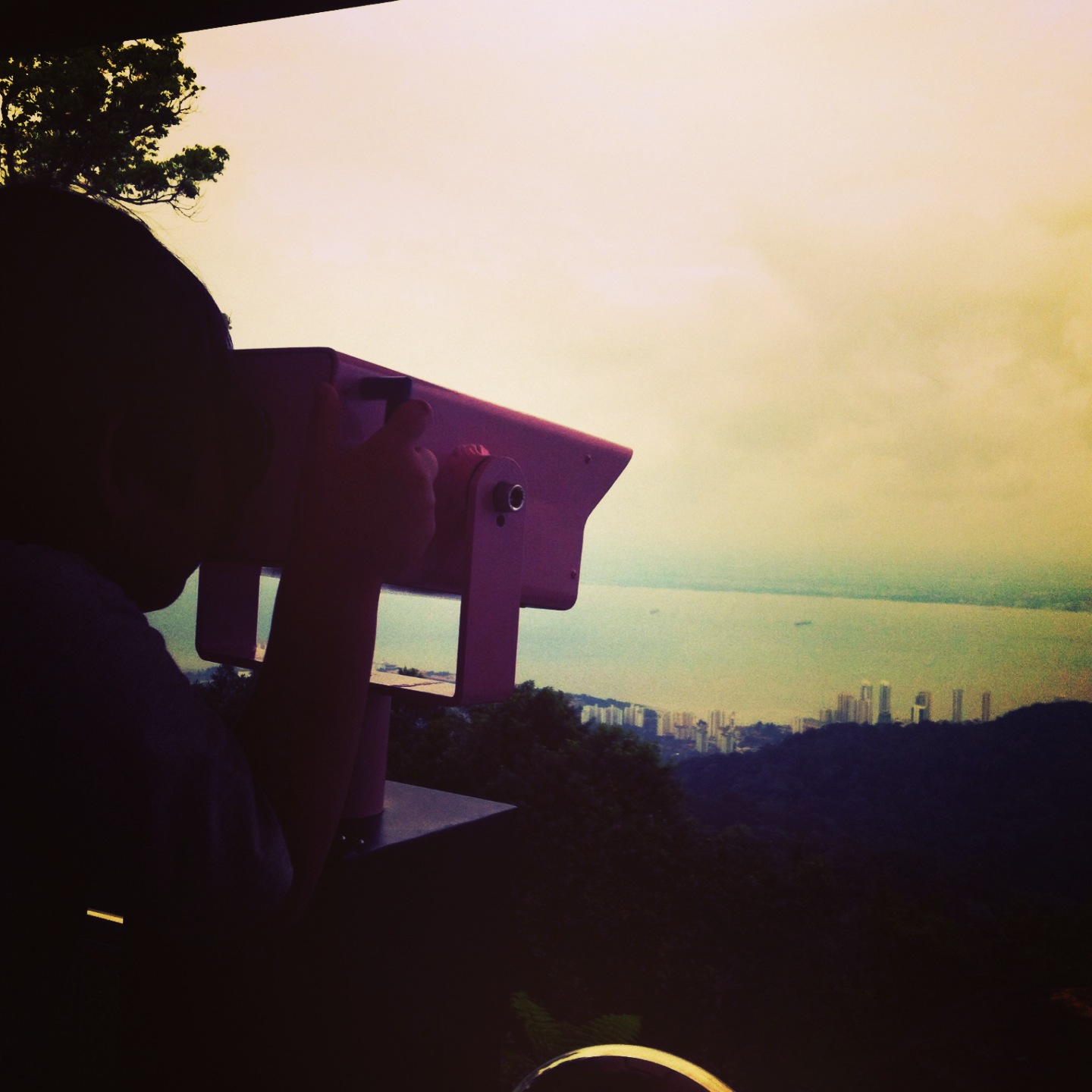 Beli tiket, naik kereta. Katanya puncak Penang Hill adalah setinggi 800an meter di atas permukaan laut. Keretanya menuju puncak bukit dengan kemiringan hampir 45derajat. Untung banget, saya dan Biyan kebagian berdiri di gerbong paling depan jadi beneran seru menikmati perjalanan naik kereta ini. Tidak securam seperti saat naik ke Victoria Peak di Hongkong, tapi yang satu ini perjalanannya jauh lebih lama, seru juga. Sampai puncak, pemandangannya memang breathtaking. Biyan menghabiskan setengah jam sendiri meneropong Pulau Penang dari sana. Di puncak ada semacam area mainan anak-anak yang mengingatkan saya akan arena mainan di Taman Safari atau kali di Puncak jaman dulu. Mainan-mainannya katro dan ga menarik buat saya. Tapi yang namanya Biyan ya, dikasih perosotan aja senangnya bukan main. Maka sore itu saya habiskan duduk-duduk di taman sambil liatin dia lari-lari.
